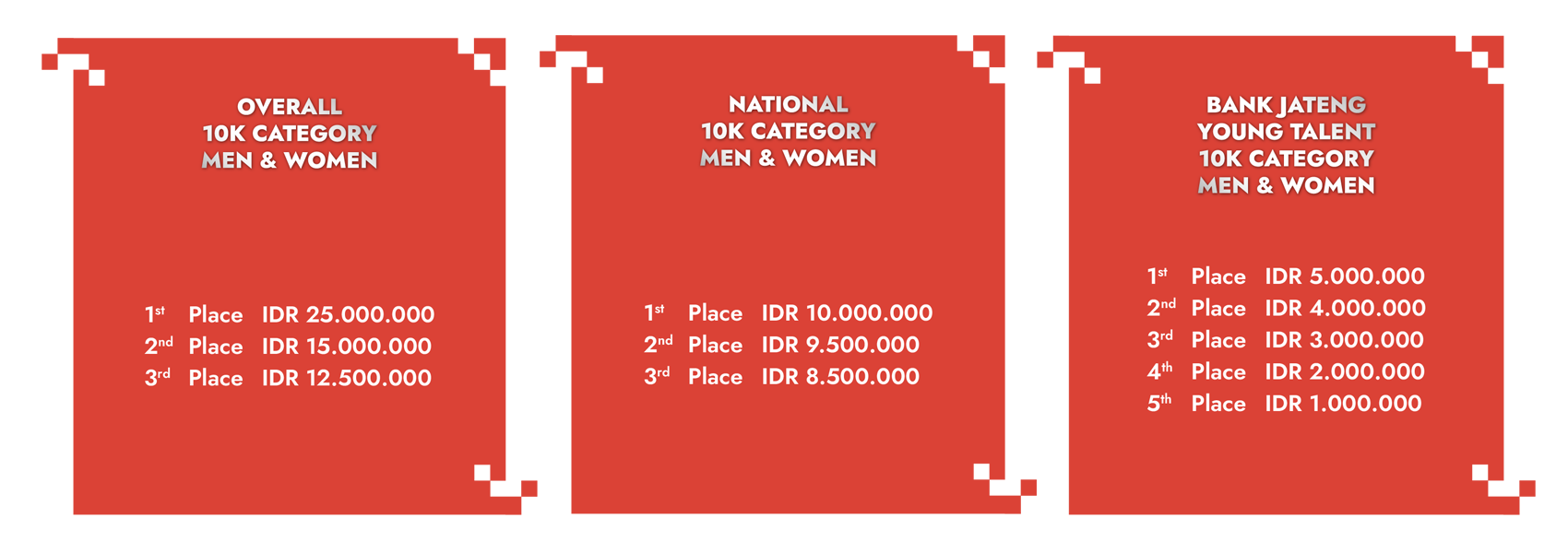 Pemenang yang merupakan Warga Negara Indonesia (WNI) berhak atas hadiah berupa uang untuk Overall Podiums atau National Podiums (jumlah uang mana yang lebih tinggi). Pemenang tersebut hanya berhak atas podium dan hadiah yang dimenangkannya.ย