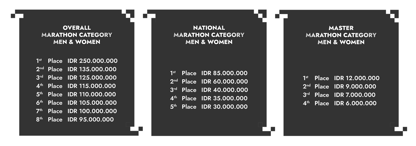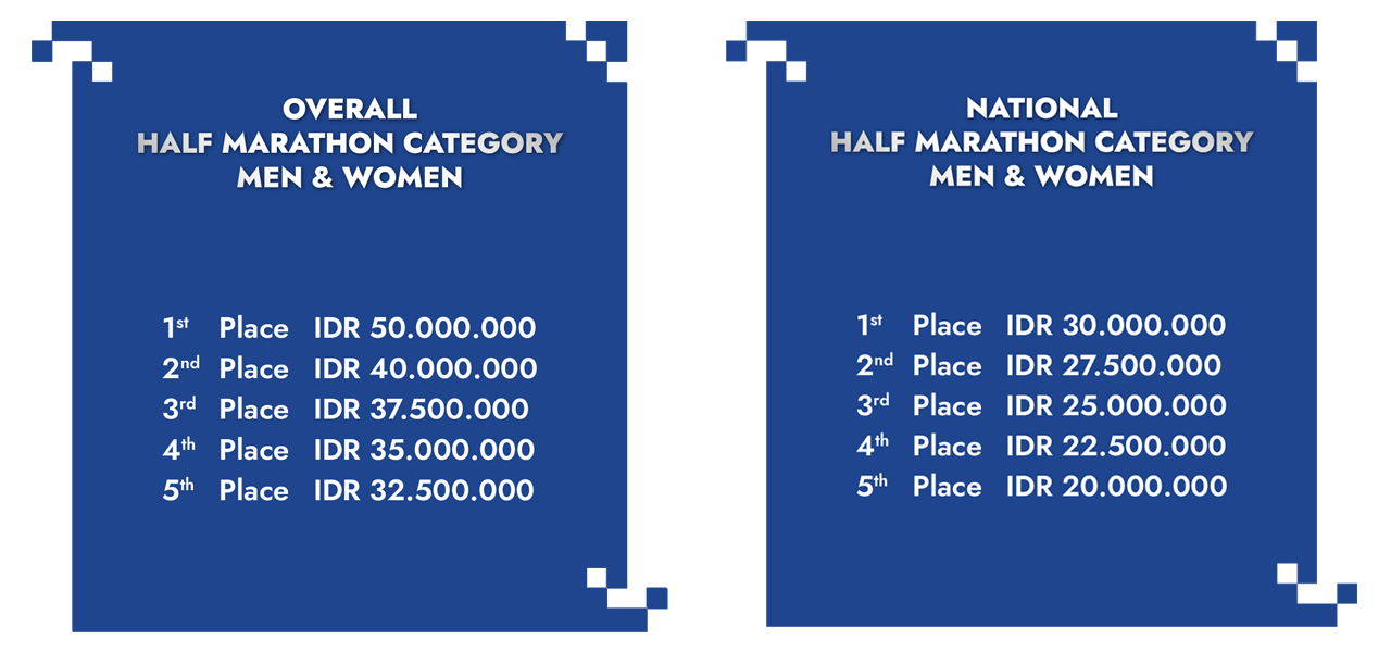 Pemenang yang merupakan warga negara Indonesia yang berusia 40 (empat puluh) tahun dan/atau lebih dari 40 (empat puluh) tahun pada Hari Lomba, berkesempatan untuk memenangkan Overall Podiums, Indonesian Podiums atau Marathon Indonesian Master. Pemenang tersebut hanya berhak atas podium dan hadiah yang dimenangkannya.